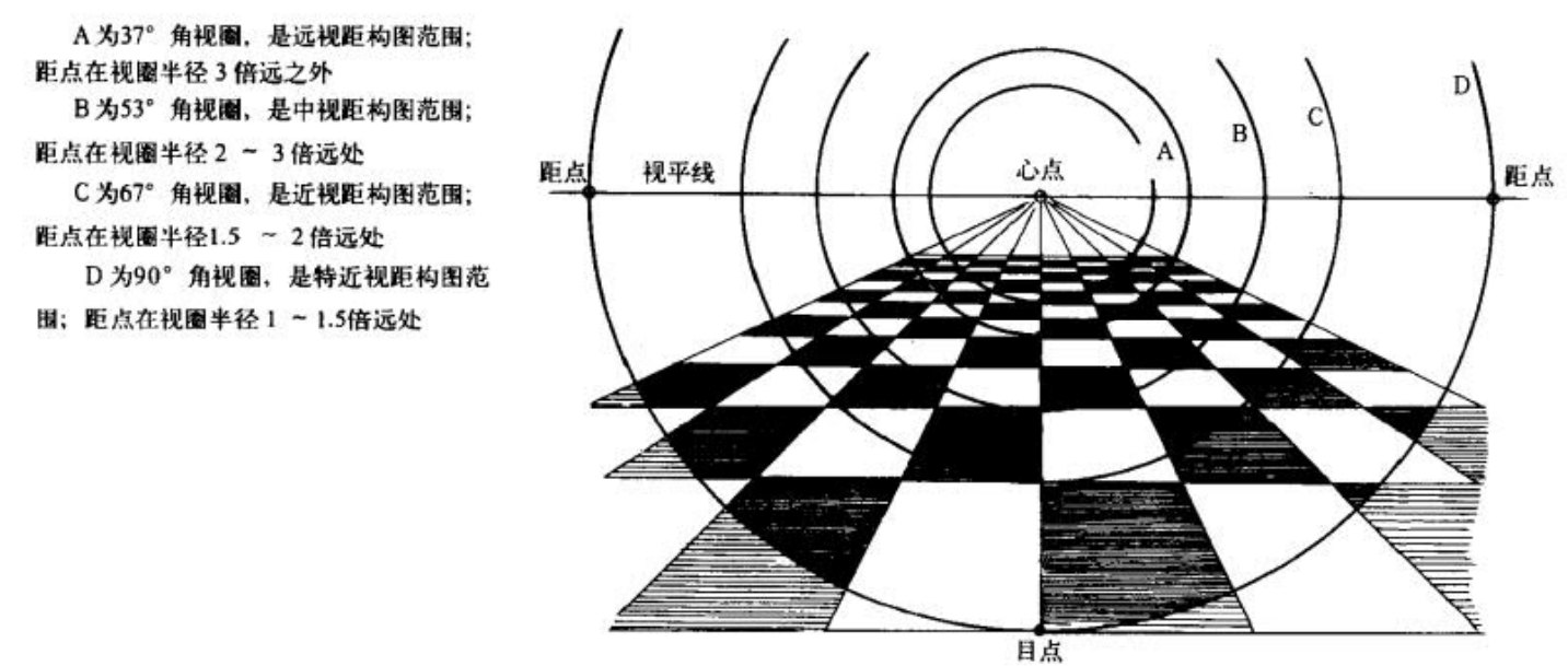 - 90 度视圈左右的点称为距点,下方的点称为目点;心点和距点的距离(实际上是心点到目点的距离)称为视距。注意目点相对于 60 度 FOV 的距离——目点到心点的距离是 60 度视圈半径的 $\sqrt {3}$ 倍,约等于 1.7 倍,但实际操作的时候使用 2 倍也没问题(这时候实际上对应的是 53 度视圈)