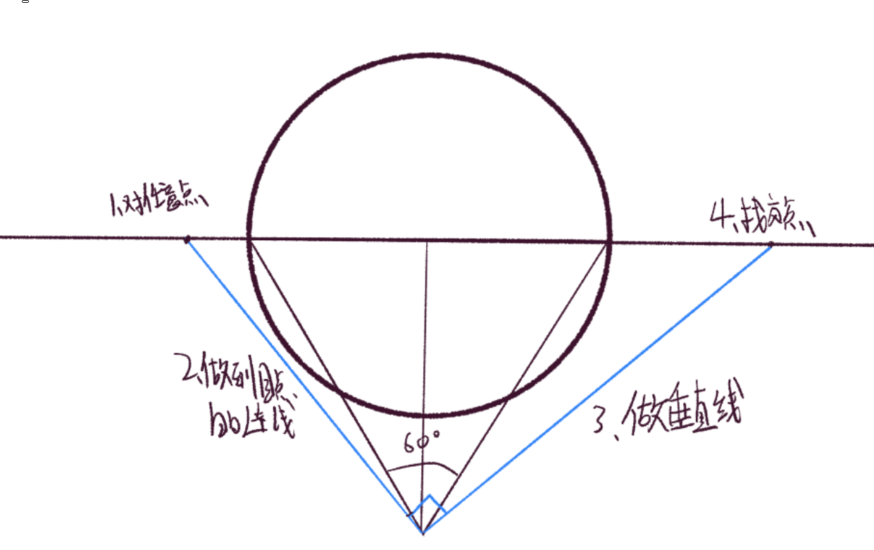 之前的学习中,我发现,一个消失点在这里时,另一个消失点可以在画面中心另一侧的任何地方。然而,在两点透视时,确定这两个消失点无法确定心点和目点,从而无法确定焦距,三点透视时则可以确定心点(三个消失点组成的三角形的垂心),从而能够确认距点到心点的距离,从而能够得到 90 度视圈。