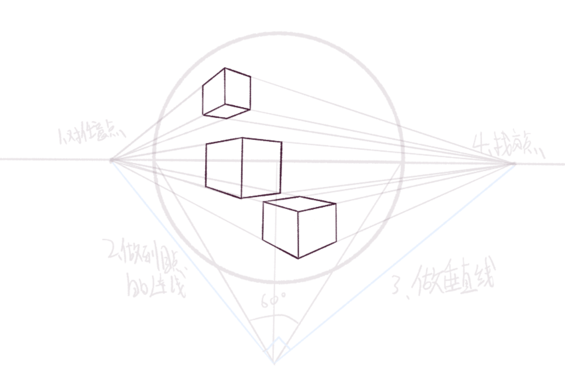 可见,只有 30-60 度消失点的距离还算是容易画出来和看出来的,消失点如果更远,作图就困难了,而此时很小的角度变化就能引起消失点很大的变动,这时候或许不需要那么在意精确度,画成近似一点透视亦可,言之有理即可。