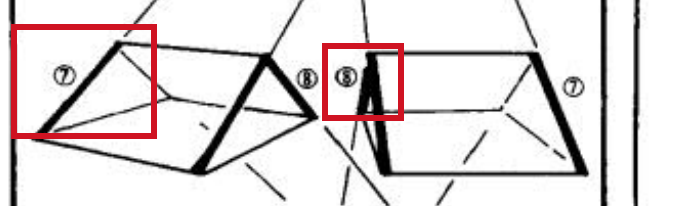 注意这里引入了近,远的概念,因为只看线条本身是看不出它是朝上还是朝下的。比如这里圈出两根线,它们一个向上一个上下,但看上去都是向右上的。