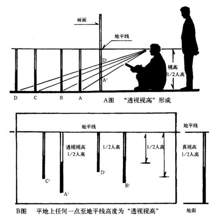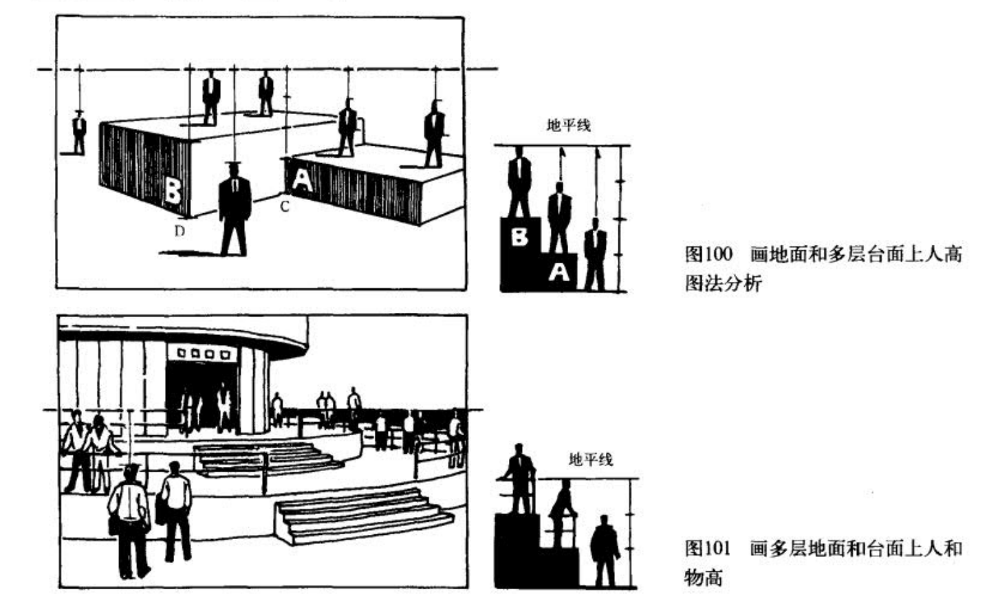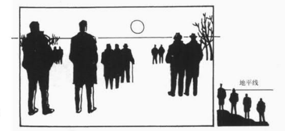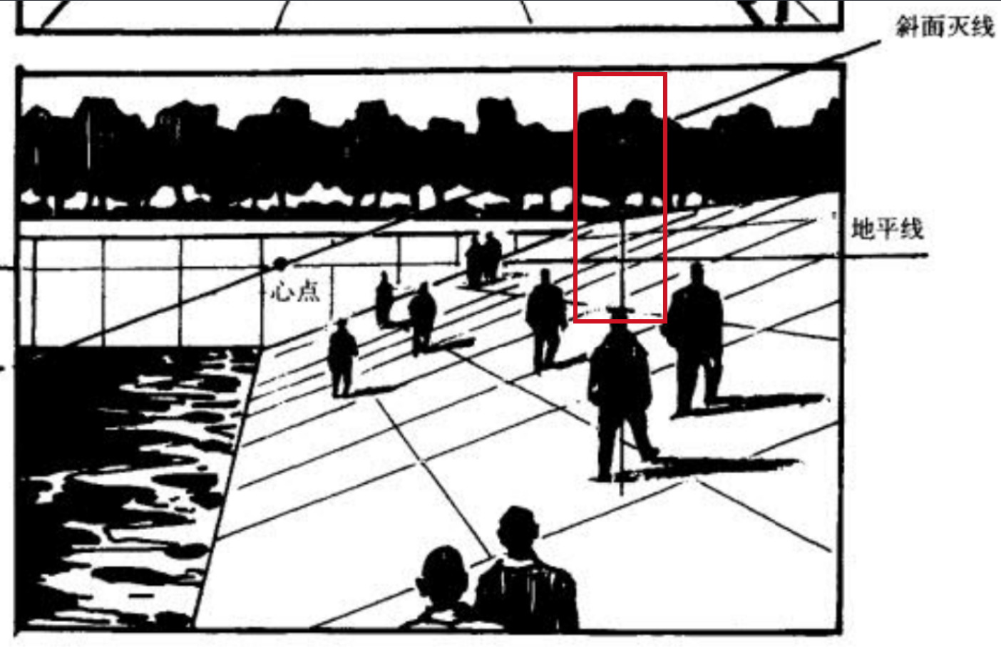 容易发现,视高法利用上了镜头的高度(地平线),不用画缩尺就能画出不同远近的人。视高法就是利用视高的透视高度就地量得物体的透视高度。