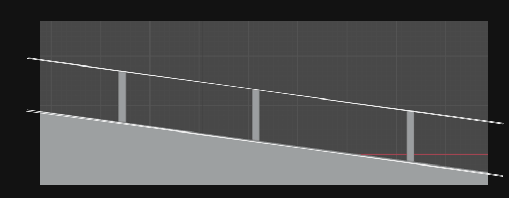 这个斜面是“滚转”的。思考方式和下斜、上斜面一样——考虑斜面平面,以及所有人的头顶构成的平面,注意到,镜头正好放在斜面上时,所有人的脚都在灭线上;镜头正好在头顶平面上时,所有人的头都在灭线上;镜头在人的腰部平面上时,所有人的腰部都在灭线上。