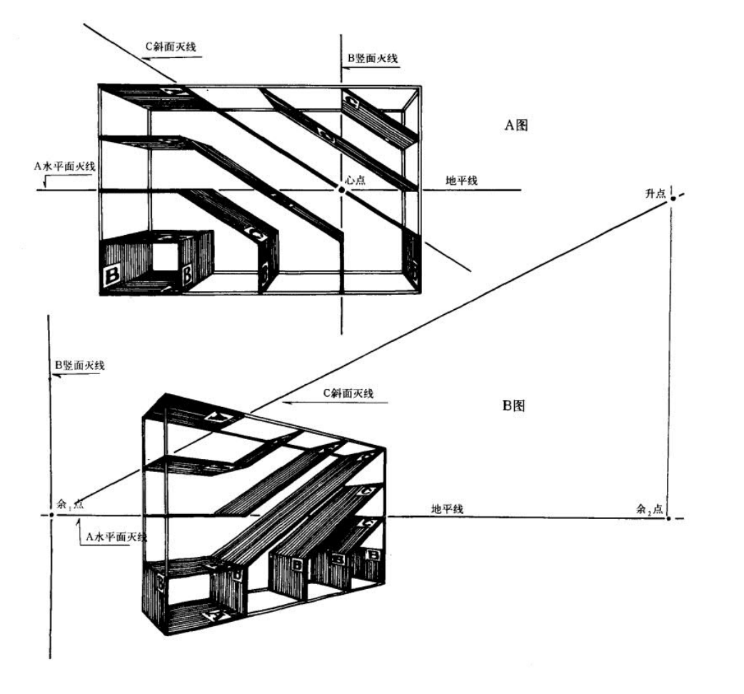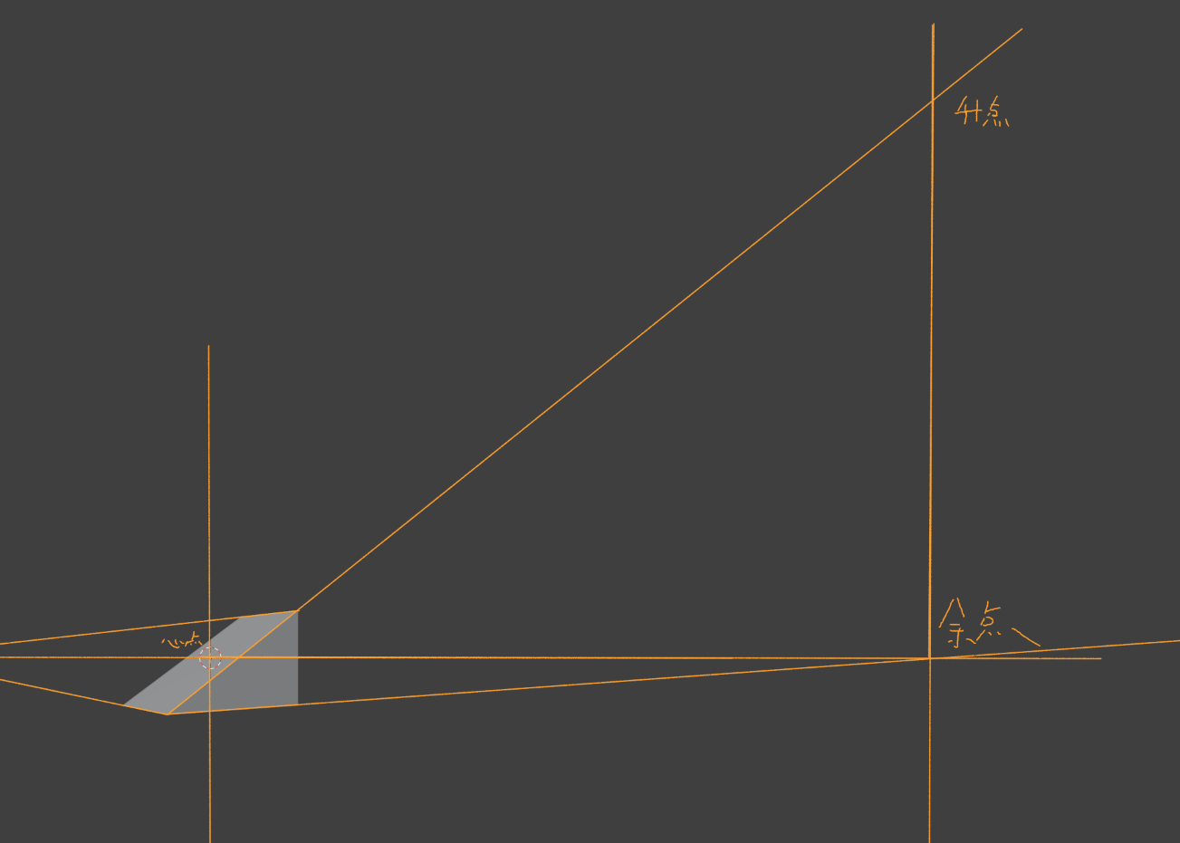 注意到,平面的灭线就是视平线,下斜、上斜面的灭线平行于视平线,而向心点斜面的灭线倾斜于视平线,但是和视平线交于心点。这里当然还能有一种更广泛的斜面——灭线倾斜于视平线,且和视平线不交于心点的斜面,这时候的斜面是余角透视的。这个斜面是最复杂的斜面了。