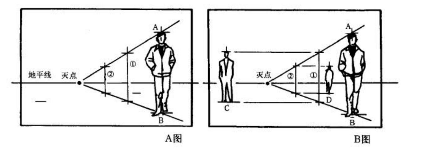 缩尺法可用于拷贝物体的高度,上图给 B 处的人物做缩尺,然后在①处做平行线(在画面上左右移动)得到等高的人物 C,②处做平行线得到登高的人物 D。