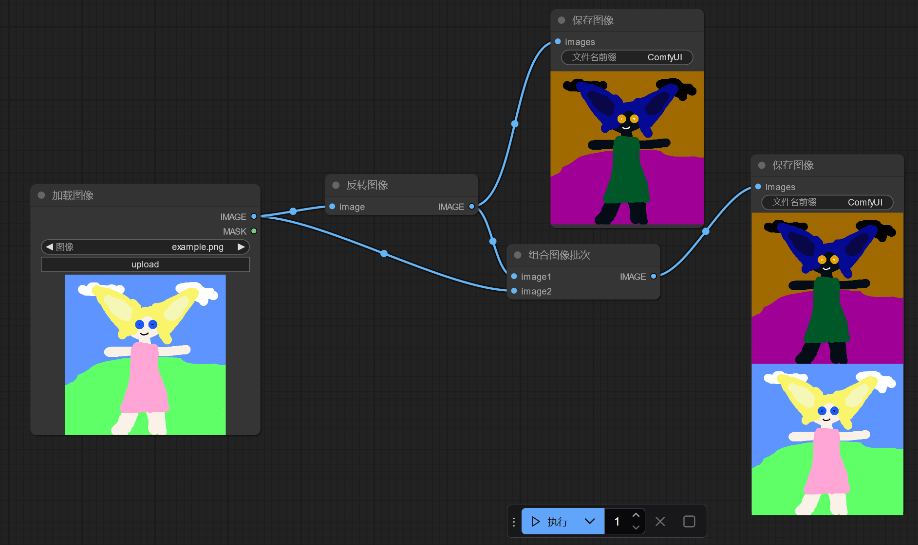 但注意到这里其实也不能直接称为编程——没有结构化语句,没有循环,一个节点的逻辑执行完后,它的状态就不会再改变,无法再度执行了。要实现可编程能力,我们需要使用列表去模拟循环,对于多重循环,需要做出它们的笛卡尔积。实际上,ComfyUI 的很多节点的输入既支持标量也支持向量,如下面同时输出图像和反转图像。