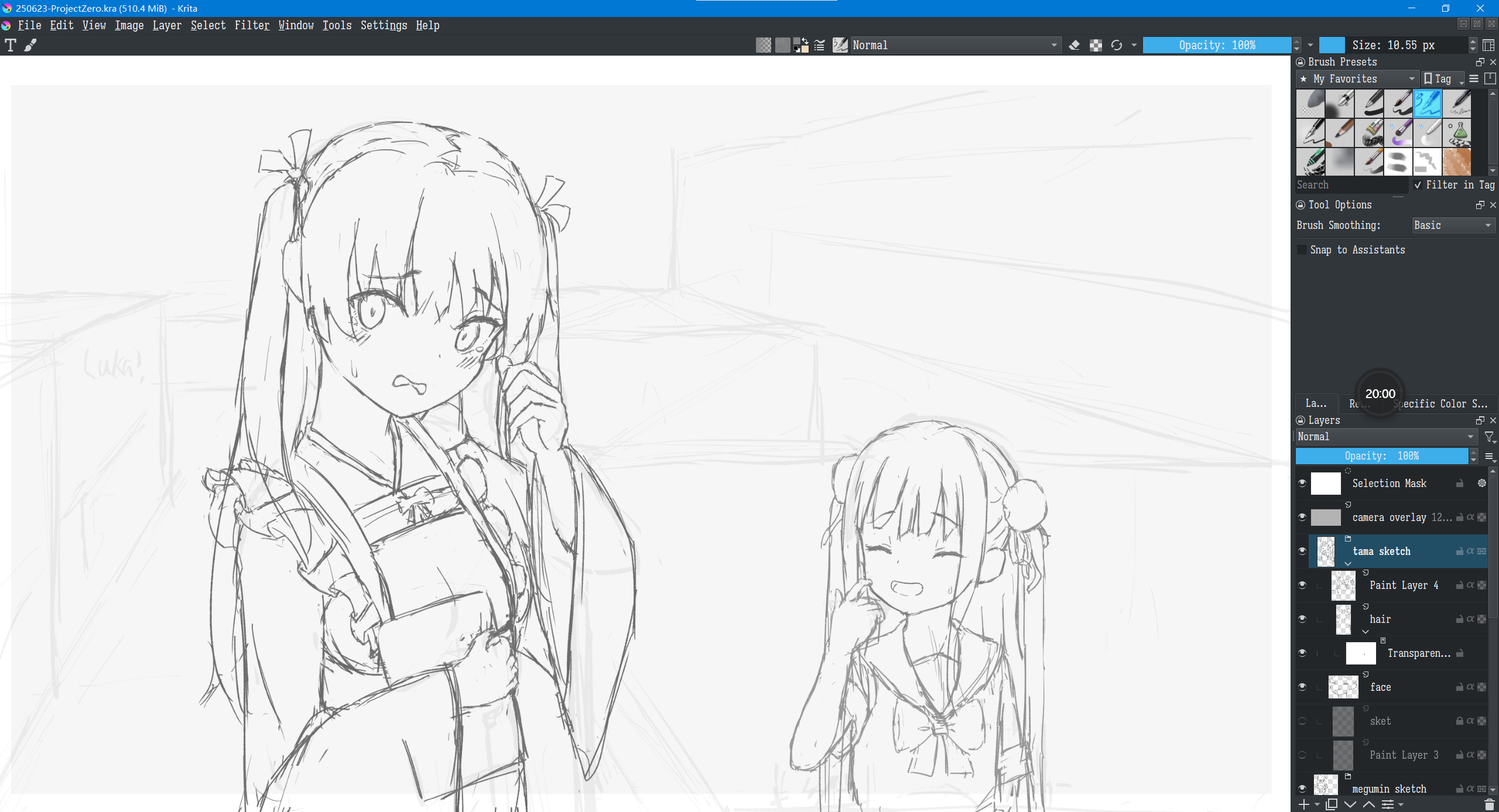 - 关于透视,关于草图的起法,我是先定俯视图再定内容的,这可能不是个好的选择,按理说应当是定好构图后(这一步是二维的)直接起草图。以及起了草图后对镜头,人物的安排几经修改(搞得实际上我之前想表达的很多东西都没能表达出来)……而我觉得我现在连问题出在哪里都没有好好描述清楚。好在Krenz的透视课程可以说就是专门是关于透视草图的起法的