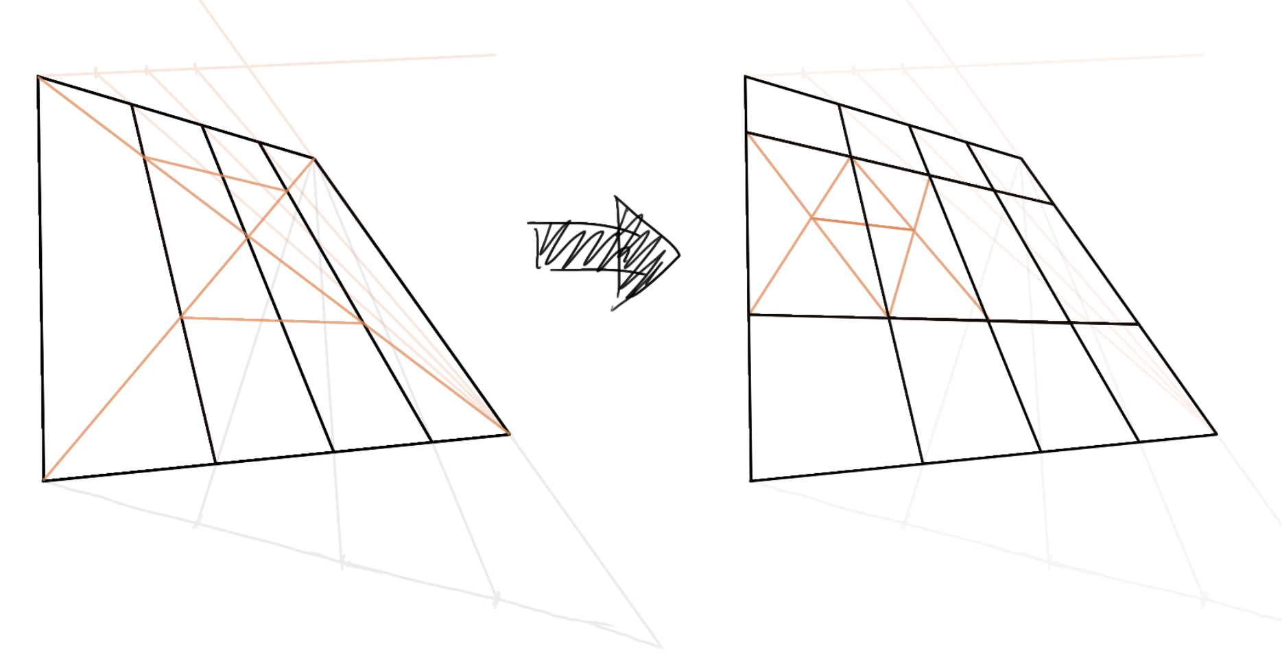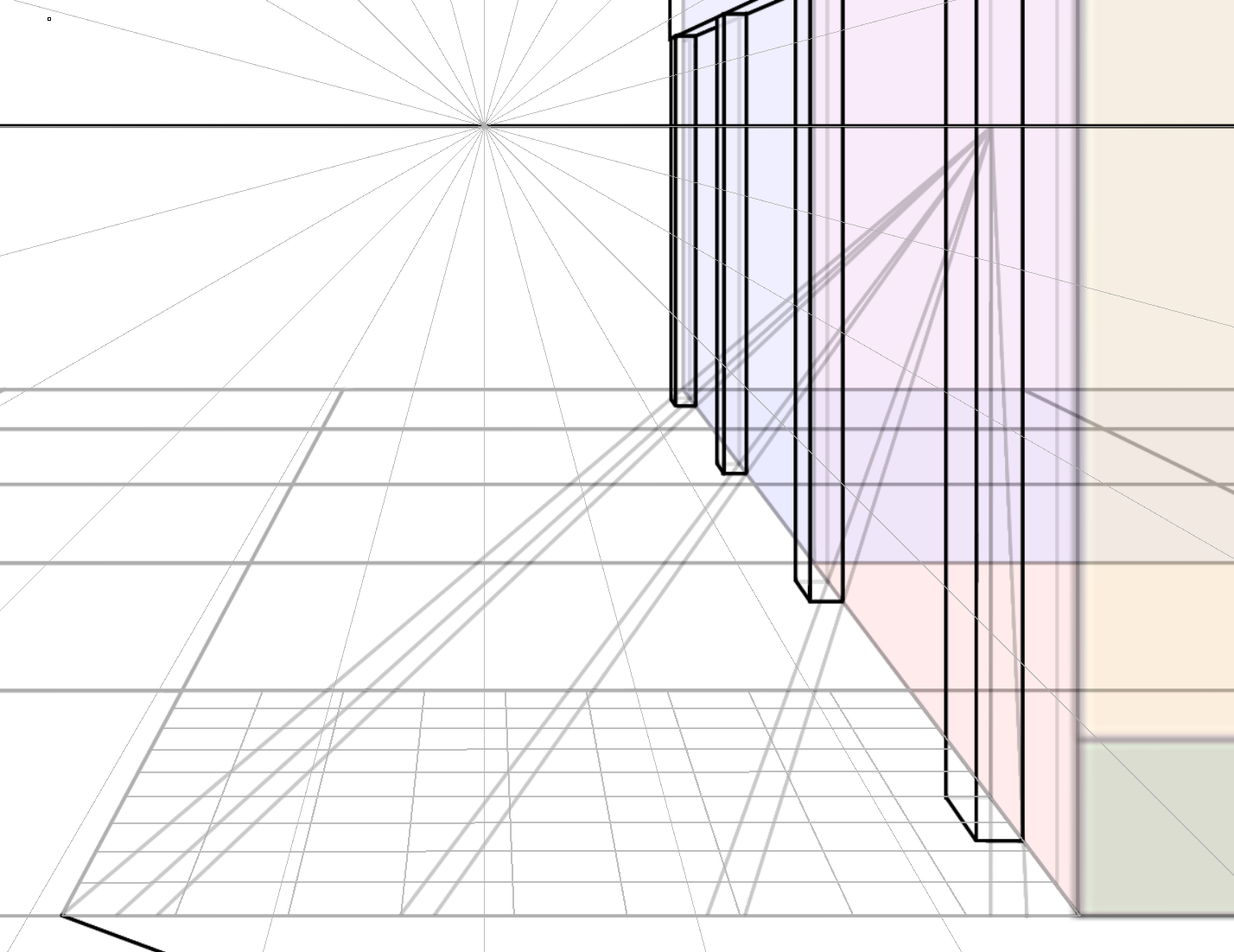 当然,鲁米斯方法最酷的地方在于,你能轻易地把原线上的任意比例投影到变线上,这在绘制间隔的柱子等情况下极其方便。而且在这原线上的比例,你不需要画的完全精确——随便有点意思就行了,骗过眼睛是很容易的。