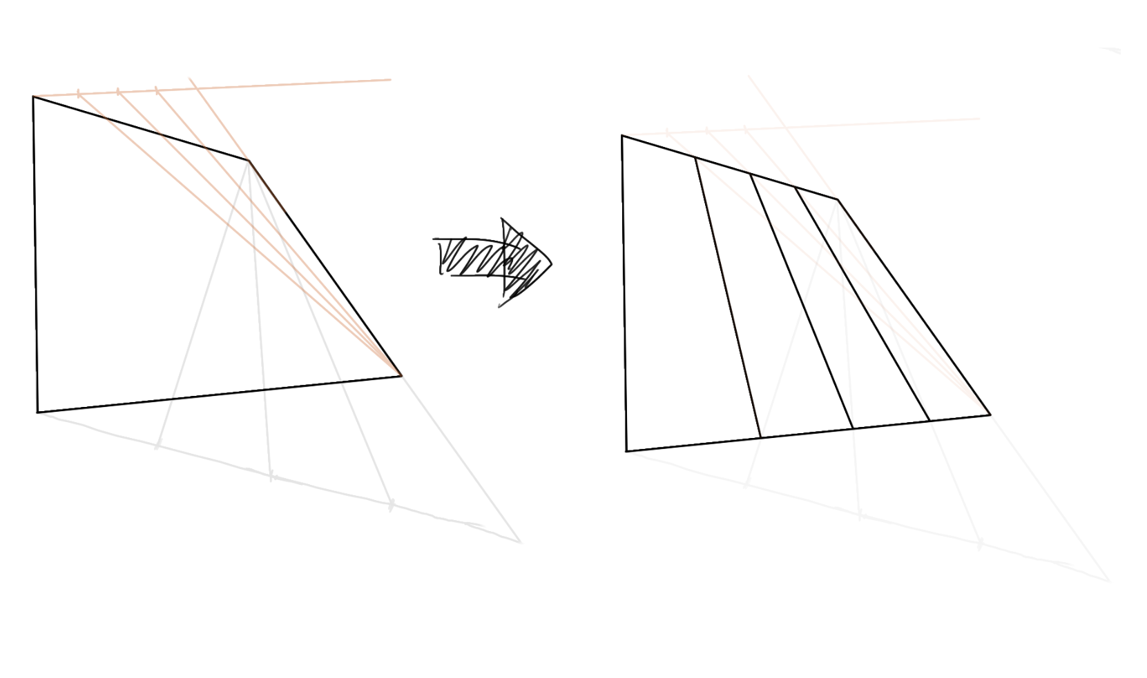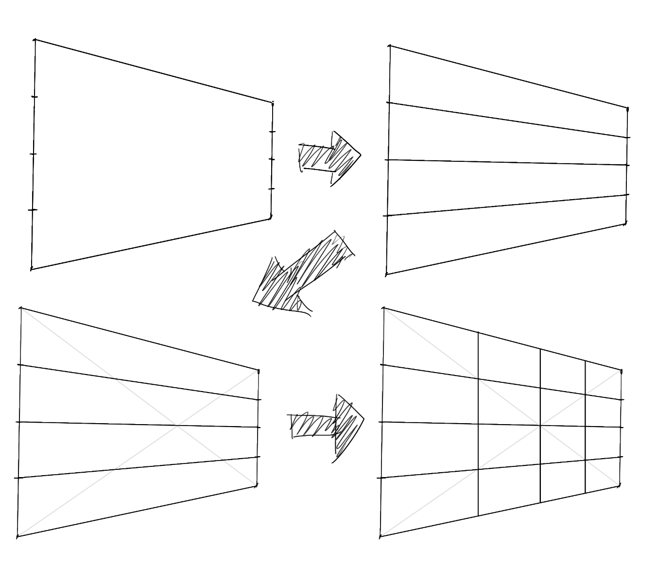 首先,对原线这对边(即下图的垂直边),我们知道,原线是平行于画面的,因此原线是不存在透视缩短的,因此这里直接用目测找四等分并相连即可:
